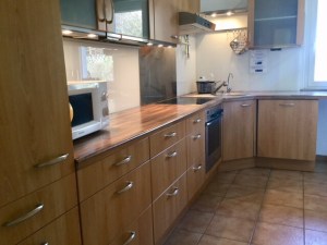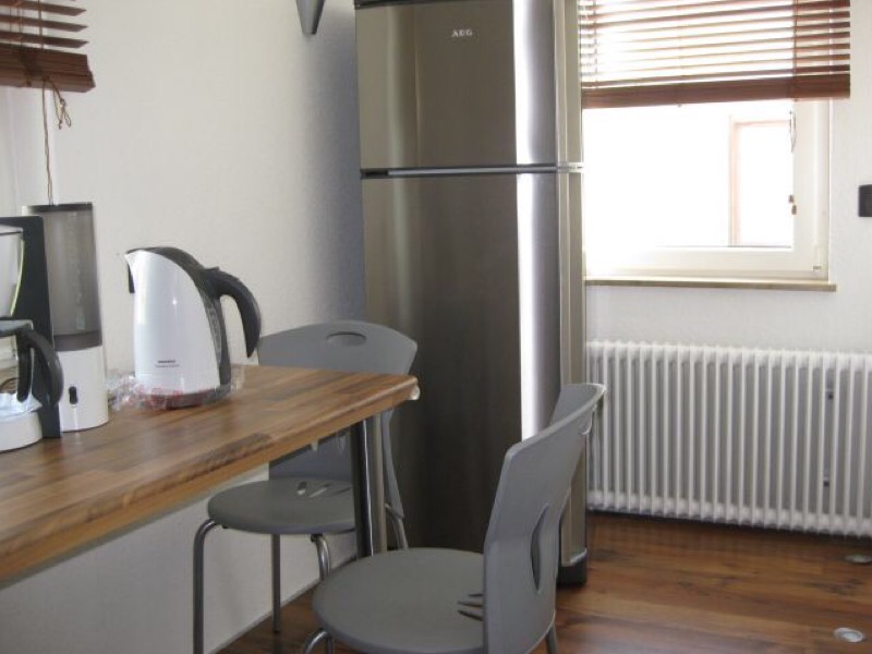 - Einbauküche mit Essecke und Stühle: Geschirrspüler, Ceran-Kochfeld, Backofen mit Grill, Kühlschrank mit Gefrierfach, Kaffeemaschine, Wasserkocher, Toaster, Besteck, Kochgeschirr